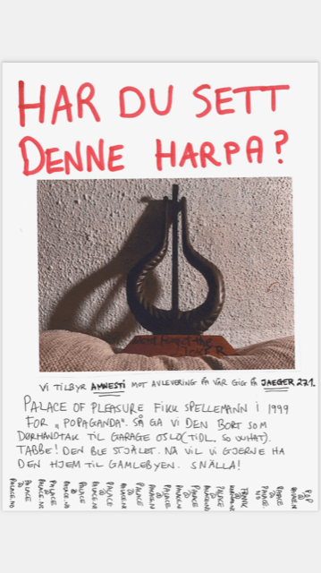 I forbindelse med konsert på osloklubben Jæger, ble det januar 2023 sendt ut en etterlysning av spellemannsharpa (Popaganda, 1999) som på mystisk vis forsvant den gangen klubben het Garage Oslo. Dessverre dukket ikke tyv eller harpe opp, så etterlysningen er fortsatt gyldig.