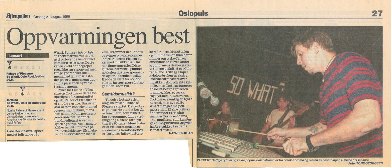 Vår første sekseranmeldelse! Gleden kom også med en gåte, nemlig billedteksten: “heftige rytmer og vakre popmelodier strømmer fra Frank Kornmo og resten av besetningen i Palace of Pleasure”. Bildet viser Tortoise, og ikke visste vi hvem Frank Kornmo var.
